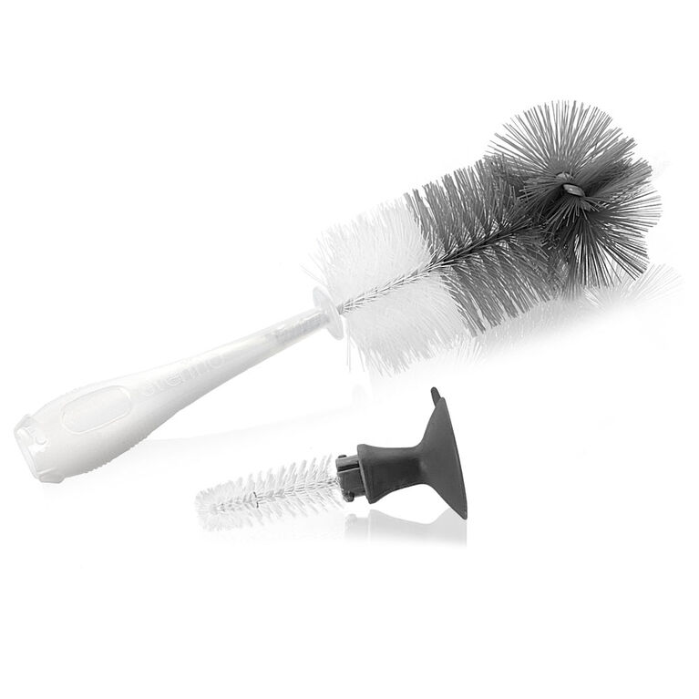 Keep your baby bottles clean with the Evenflo Feeding 2-in-1 Bottle Brush. Designed with non-scratch bristles and a sturdy handle, this bottle brush is tough on milk and other liquid residue, yet gentle on your glass or plastic bottles, cups and other feeding accessories. A second smaller brush, stored inside the handle of the larger bottle brush, is great for use on bottle nipples, pump parts and other small accessories. To help keep your brush clean and safe from germs, this bristle brush is sponge-free, helping to reduce the growth of bacteria. The suction cup on the bottom of the brush provides upright, sink-side storage. The 2-in-1 Bottle Brush is dishwasher safe (top rack only) and includes a discreet hole to drain excess water after cleaning. The bottle brushes are 100% free of BPA, polycarbonates, PVC and phthalates and are made of FDA-approved food grade material.