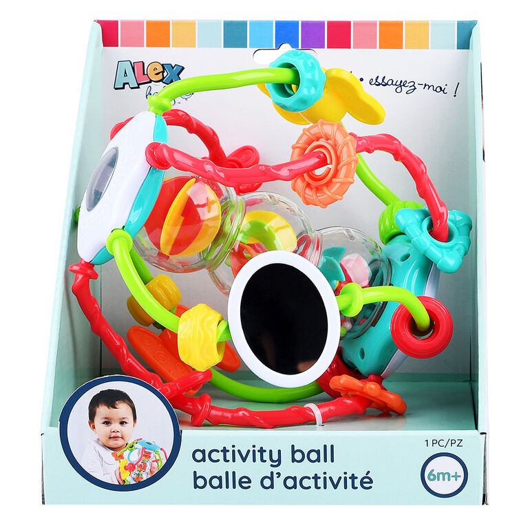 The Activity Ball has easy-to-grasp handles with texture so your little one can slide, twist, shake and spin the colorful shapes.