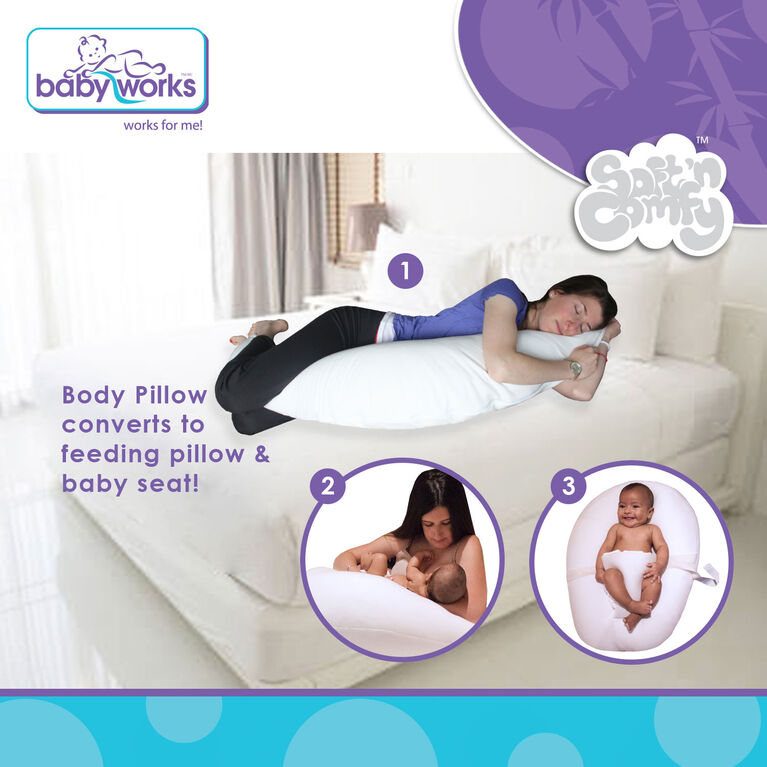 Super soft and supportive: finally. A pillow that truly does it all with its innovative design this crescent shaped pillow is ideal for supporting your front or back during pregnancyMulti purpose to grow with you and your baby: the pillow is full of features and functionality and is designed to grow with you and your baby through the many milestones of pregnancy and beyondBamboo pillowcase included: the pillow comes with a hypoallergenic fitted pillowcase made of rayon from bamboo fibers that are super soft, gentle and help keep the pillow feeling cool and comfortableAn ideal baby shower gift: most body pillows are relatively short-lived, but because of its versatility, this pillow makes an incredible baby shower giftSatisafaction guarantee!: at Baby Works, we strive to develop products that work for you and that work for you baby