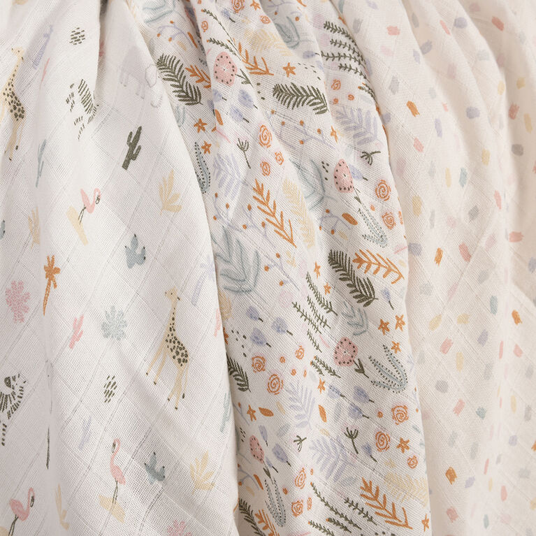 Wrap up your little one in these soft and cozy muslin receiving blankets by Baby's First by Nemcor. Made from 100% cotton, each blanket has a sweet design that will complement the nursery. Perfect as a swaddle, stroller cover, and more.
