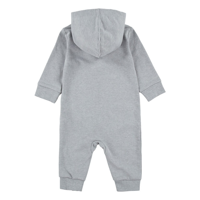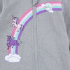 Baby French terry coverall with long sleeves, a cozy hood, full-length zipper closure, Unicorn graphic print on the front and a Chuck Patch logo on the chest.
