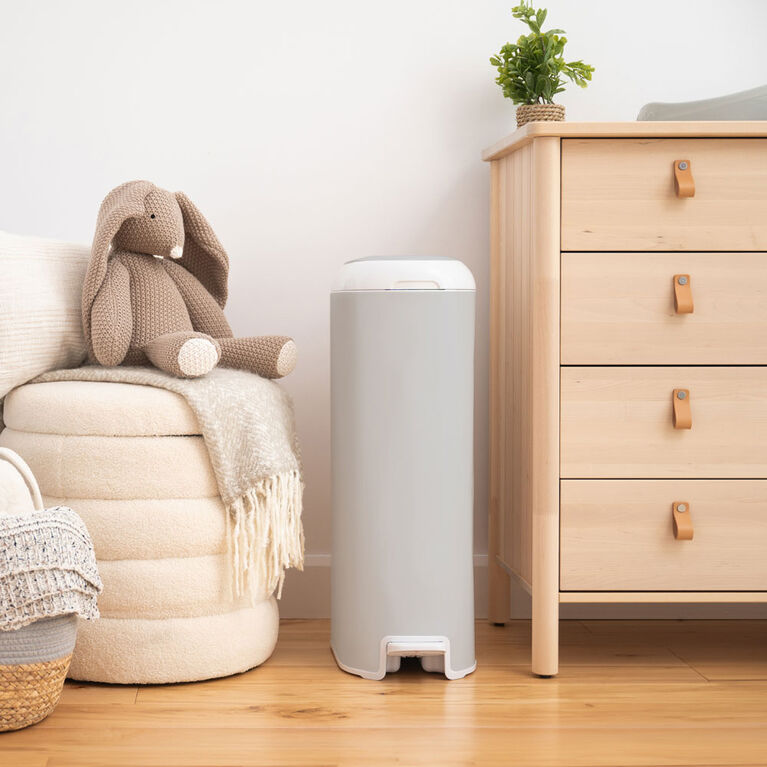 Keep your nursery fresh with our new metal pail! The new Diaper Genie Platinum pail is made of durable stainless steel and has odour-locking clamps that help prevent odours of messy diapers from escaping. With its 27" height, wide opening and foot pedal, the Diaper Genie Platinum offers true hands-free operation. Our diaper disposal system holds up to 47 newborn diapers and includes a long-lasting refill that can last up to 5 months or hold up 846 newborn diapers. The Easy Roll ™ refill bags are made from durable multi-layer antimicrobial film with odour-locking barrier technology. Refill includes 18 easy tear-off bags that are perforated for convenient use and disposal. The pail is available in lily white and stone grey.