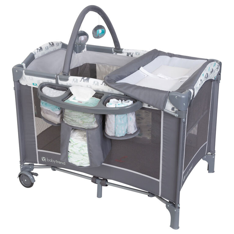 R Exclusive, only available at Toys R Us Canada. The Baby Trend EZRest Nursery Center is the perfect solution for sleeping, diaper changing and playtime! Diaper changes become a breeze with the changing station, deluxe 3-pocket parent organizer and built-in diaper stacker. The changing table with secure belt conveniently flips over when not in use. As your little one grows, simply remove the bassinet feature, move the floorboard to lowest position, and the playard becomes a safe environment for baby to play and explore. The dual wheels with brakes provide easy mobility and added security. When it's time to travel, simply fold and store the nursery center in the carry tote.