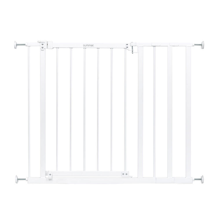 The Summer Everywhere Extra Wide Walk-Thru Safety Gate is secure, convenient to use, and can be customized to fit your space. This 30" tall baby and dog gate fits openings 28.75 to 39.75" wide and can be installed in doorways or hallways using the no-drill pressure mount system with adhesive wall cups. Hardware is included for a secure installation at the top or bottom of stairs. It's easy to operate this gate with one hand. The door stopper helps prevent the door from swinging outward over stairs.