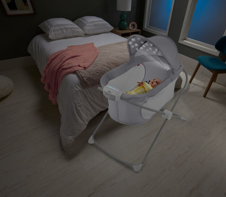 R Exclusive, only available at Toys R Us Canada. The Fisher-Price Soothing View Projection Bassinet is the perfect cozy spot for your baby to get their snooze on, at home or on the go. This portable cradle gently rocks and features calming vibration, music and sounds to help soothe baby to sleep. Unfold the soft canopy overhead, and baby will be mesmerized by two hanging toys and a starry light projection. When it's time to go, the bassinet's super-slim fold makes it easy to take along or stow away. Use only with a child who is unable to push up on hands and knees, pull up or sit unassisted.