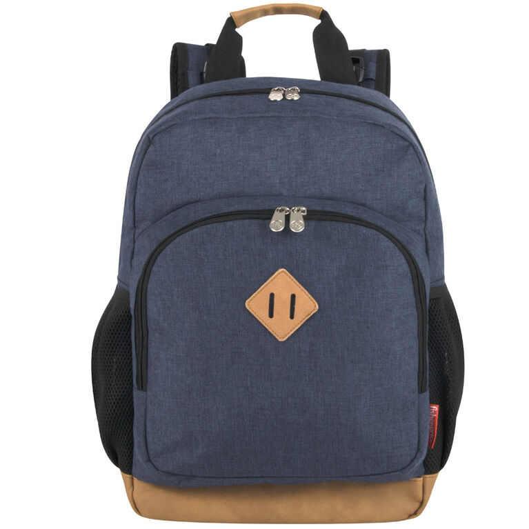 Introducing the Fisher Price FastFinder Grayson baby diaper backpack. Features include cellphone and/or snack pockets, large insulated bottle compartment that holds up to 3 bottles (milk, water, juice), keeping food, formula, and drinks fresh. Adjustable, padded shoulder straps and padded back for comfort. Main compartment has multiple pockets for everything parents and babies need and electronics slip pocket for laptops, tablets, and more. Standing feet to keep bag upright and help prevent it from picking up dirt when set down.