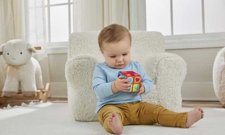 The Laugh and Learn Puppy's Activity Cube from Fisher-Price offers engaging play your baby will love to get their hands on. This retro-inspired activity toy features fun designs, textures, music and lights for toddlers to discover as they twist and turn the blocks. Plus, when little explorers press the buttons on the cube, they'll hear 25+ songs, sounds and phrases that teach the alphabet, counting 1-10, colors and shapes.