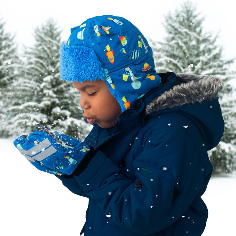 You'll welcome the drop in temperatures with our beautifully crafted trapper hat at the ready. The high quality windproof and water-Repellent shell combined with a soft sherpa lining and signature ear flaps offers excellent protection from the elements, ensuring your little ones stay warm and dry in all their outdoor adventures. Kids will love the colorful and eye-catching patterns with reflective details and, as an added bonus, you'll have no trouble at all spotting them on the ski hills. Hurray for winter!