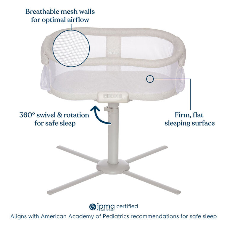 Make your transition into motherhood as easy as possible. The HALO BassiNest swivel sleeper is the only bassinet that swivels 360 degrees for the ultimate in convenience and safety. Now your little one can sleep as close as you'd like, while still in their own sleep area, reducing the safety risks associated with bed-sharing. In addition to bringing baby close, it rotates to make getting in and out of bed hassle-free. Simply unlock each side and the bedside wall will lower with a gentle touch, allowing you to scoop up your baby for cuddles or nursing without the need to get out of bed. For safety, the wall automatically locks when back in the upright position. The Premiere series includes a soothing center with nightlights, four soothing sounds, and two levels of vibration to help relax baby for sleep. Its stable, adjustable base fits under almost any bed. It includes a convenient storage pocket to keep your baby's essentials close by. Recommended for babies up to five months of age or 20lbs. Use should be discontinued when infant shows signs of pulling up, rolling over, pushing up to kneeling position.
