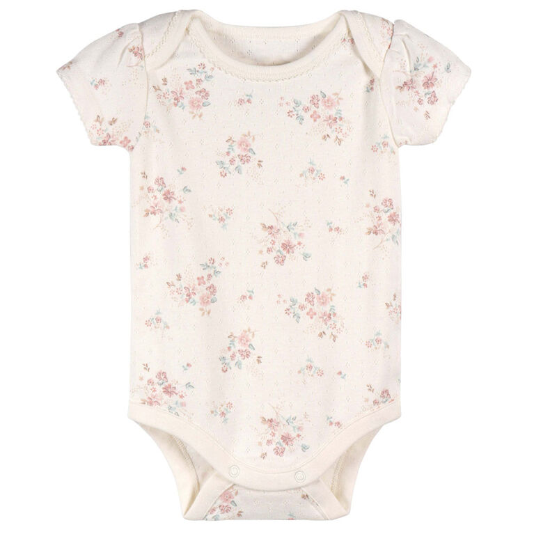 Our versatile set of three baby girl bodysuits, designed with your little one's comfort in mind, are crafted from 100% soft cotton to be gentle on sensitive skin. With convenient leg snaps, dressing and diaper changes are simple, and the rounded, ribbed neckline and leg holes provide a comfortable fit. Short sleeves keep your baby cool during warmer weather and can be paired with shorts or other bottoms for a cute baby outfit. This set includes two pullover bodysuits with lap shoulder necklines for easy dressing, and one with a side snap style for added convenience.