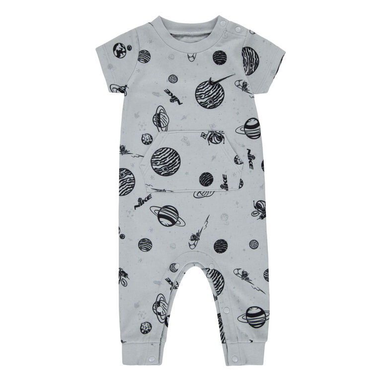 This short sleeve all-in-1 by Nike is made of soft jersey knit fabric little ones can be cozy in, features an allover space graphic print and snap closures at the shoudler and inseam make changing and dressing easy.
