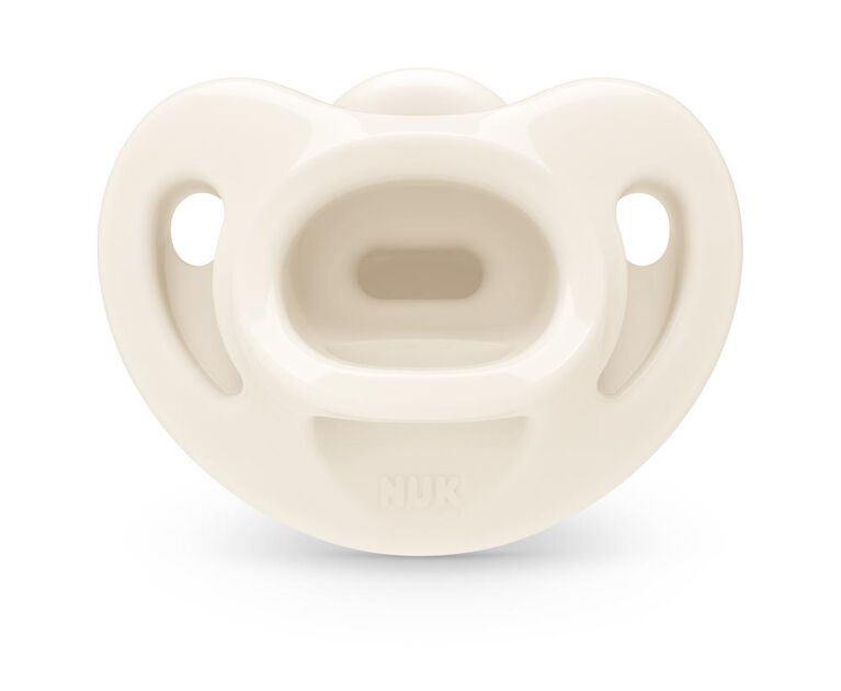 NUK Comfy Pacifiers feature a one-piece 100% silicone design that gently contours to baby's face. The heart-shaped shield fits perfectly under baby's nose for easier breathing and to prevent irritation. The unique, breast-like nipple naturally fits baby's palate and helps promote healthy oral development. Invented over 60 years ago by pediatric dentists and doctors, NUK orthodontic pacifiers are modeled after the natural shape of mom's nipple while breastfeeding, creating an easy transition from breast to pacifier and back. The NUK Comfy pacifier is made of 100% medical-grade silicone, and is BPA-free and dishwasher-safe (top rack only).