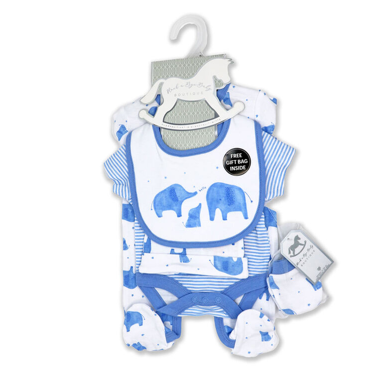 5 piece set makes a perfect baby gift and is ready to give with included gift bag 100% Cotton Set includes- 1 footie sleeper, 1 bodysuit, 1 bib, 1 beanie and 1 pair of mittens Footed sleeper has long sleeves while bodysuit has short sleeves Machine Washable, Easy Care, Dry