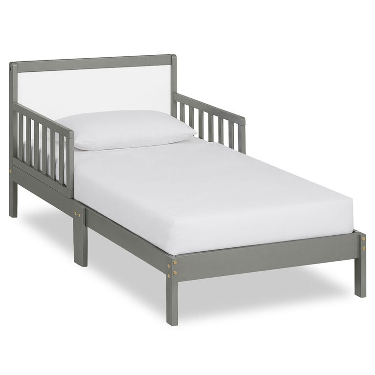 Let your little one transition from a crib to a toddler bed with ease thanks to the Dream On Me Sydney Toddler Bed! The bed sits low to the floor making getting in and out easy. It comes with two side safety rails and the center legs provide reinforced stability. The Sydney sports a chic and modern silhouette- the bell-shaped full panel headboard design will blend nicely into any kid’s room, making it a beautifully crafted piece of furniture. It is available in elegant finishes- perfect to go with whatever décor theme your toddler wants! Safety is always our top priority. The toddler bed is JPMA certified and designed to meet/exceed all applicable ASTM and CPSC standards. It is free of phthalates, latex, lead and BPA and is ergonomic, stable and sturdy. Sturdy wooden slats provide mattress support. The dimensions are 53 H x 29 L x 28 W inches and it weighs 19 lbs. Maximum weight limit is 50 lbs. Choose any Dream On Me non-toxic, Greenguard certified standard crib mattress for a perfect fit. - Designed low to the floor, safety guard rails - Wooden mattress support rails - Constructed out of New Zealand pine wood - Tested for lead and other toxic elements to meet or exceed government and ASTM safety standards