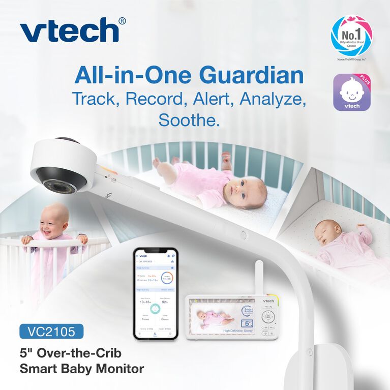 VTech VC2105 V-Care 1080p WiFi Smart Nursery Remote Access Over-the-Crib View Video Baby Monitor with 5" High Definition 720p, Artificial Intelligence, Sleep Analysis, Night Light, Rollover and Face Covering Detection, (White)