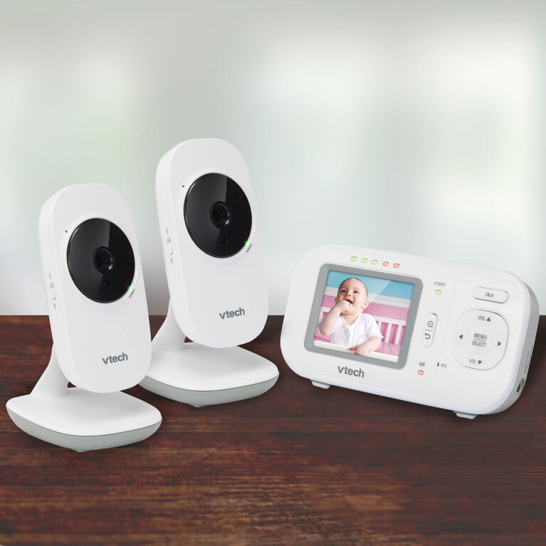 R Exclusive, only available at Babies R Us Canada. The VTech VM2251-2 2.4' Digital Video Baby Monitor with 2 Cameras makes it easy to keep an eye-and ear-on your little one from anywhere in the house. The high-resolution, 2.4-inch color LCD screen on this digital monitor ensures you can see every giggle and smile with full-motion video. Plus, up to 1,000 feet of range means you can check in from almost anywhere in the house. Extra features like the temperature sensor on the VM2251-2 baby monitor keep baby cozy. A two-way, talk-back intercom lets you soothe your child without entering the room. Automatic infrared night vision gives you a clear view of the nursery even with the lights out, so you can check in without disturbing your little one.