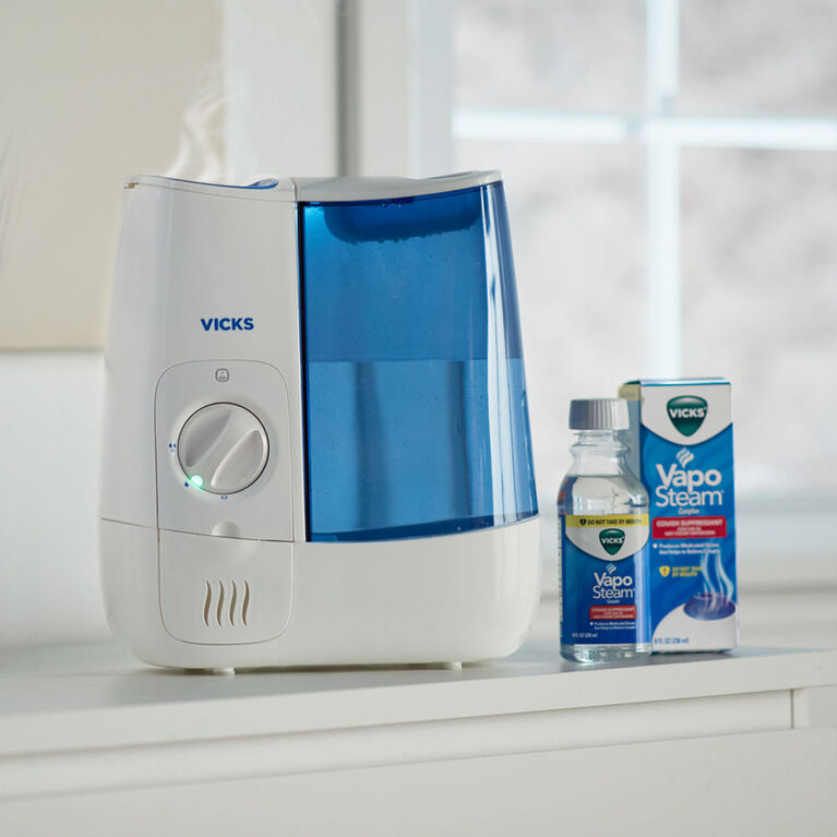 • Super Easy to Use: Just fill the tank with water, add a capful of VapoSteam in the blue medicine cup on top, plug it in, and turn the dial. That’s it!
