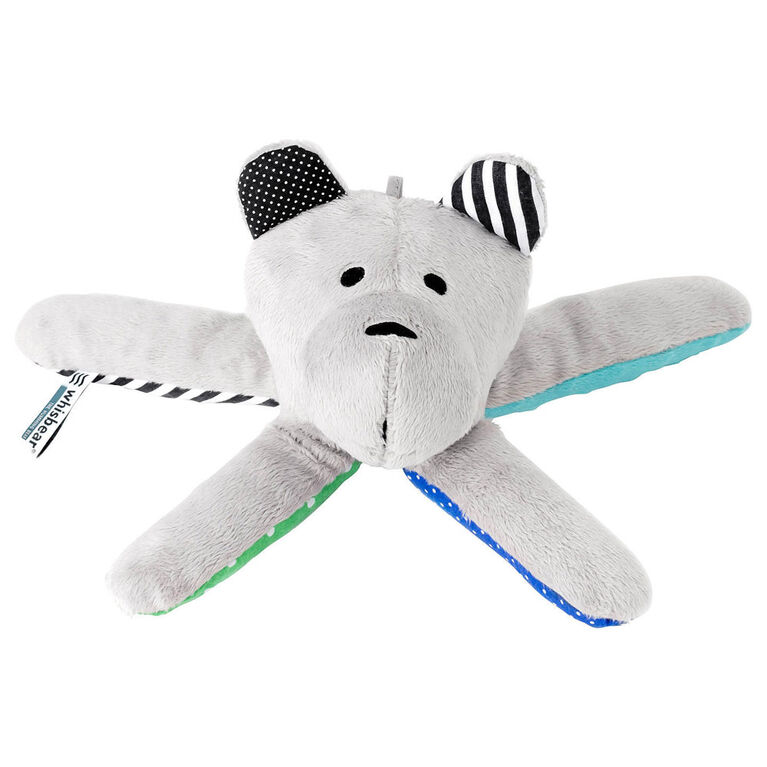 To encourage sensory and fine motor development Whisbear makers used some rustling elements in the ears and paws along with contrasting colours and different textures of fabrics. They advise not to put anything into your baby's cot for the first year of their life - magnets hidden in the paws will help to attach Whisbear to the side of the cot or a Moses basket but also to a car seat, pram handle or a changing bag.