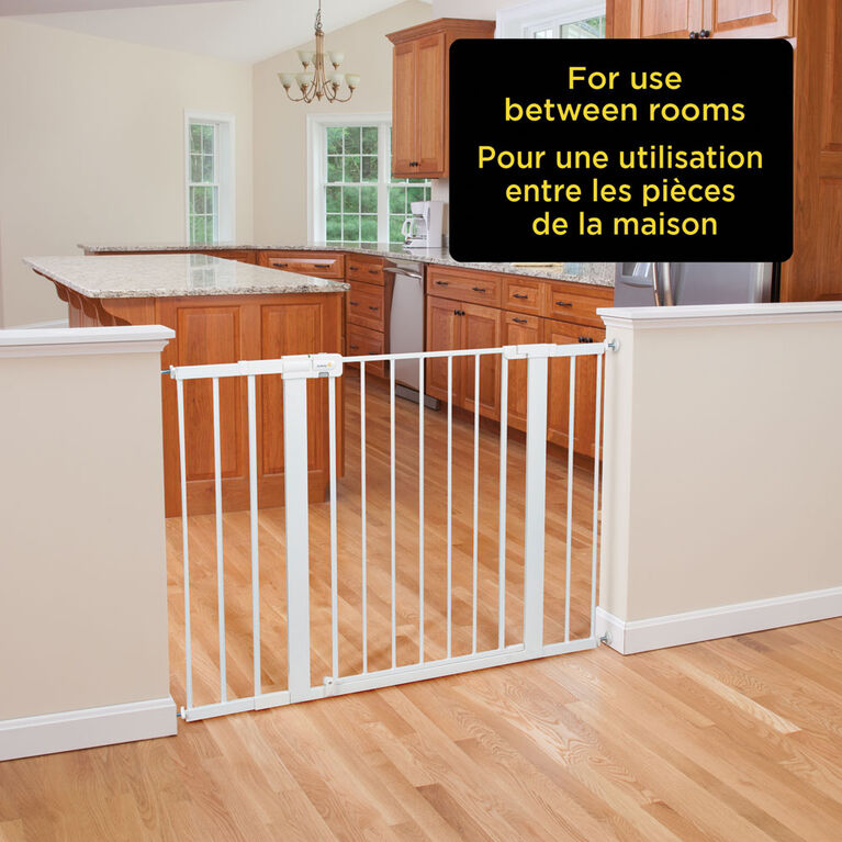 Maintenant que bébé est en mouvement, la barrière de sécurité pour bébé Safety 1st SecureTech extra-grande and large permet de créer facilement des zones adaptées aux enfants dans votre maison. Pour une utilisation entre les pièces, une barrière traversante permet de se déplacer facilement dans la maison, sans avoir besoin de la réinstaller à chaque fois que vous passez. Les barrières installées par pression offrent une grande souplesse d'utilisation dans la maison. Les coupelles murales restent installées sur le mur tandis que la barrière peut facilement être retirée pour les périodes de non-utilisation. Une barrière extra-large vous permet de bloquer facilement les passages les plus larges de votre maison. Cette barrière extra haute est également conçue pour offrir une protection supplémentaire en hauteur et convient parfaitement aux maisons où vivent des bébés et des animaux de compagnie. La barrière a une hauteur de 91cm (36 pouces) et peut être ajustée de 74-119cm (29 à 47 pouces).