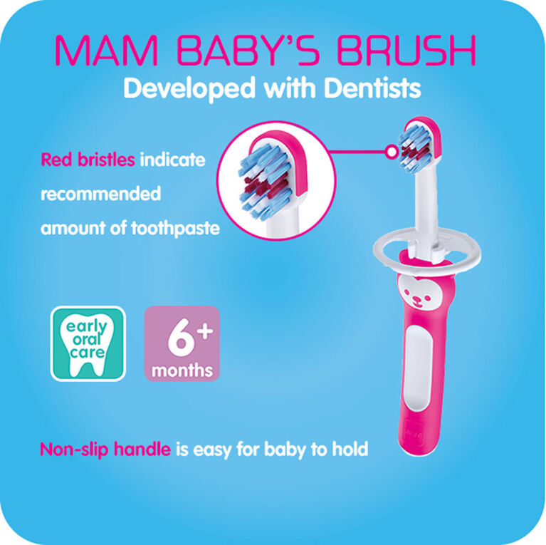 Les nouveaux produits d'hygiène buccodentaire MAM, dont l'ourson Brushy, ont été développés en collaboration avec des dentistes afin que les bébés adoptent des habitudes d'hygiène dentaire efficaces et durables dès la naissance. L'ensemble d'apprentissage Learn to Brush MAM comprend une brosse d'entraînement Training Brush, une brosse Baby's Brush et un bouclier de protection. La brosse d'entraînement Training Brush est munie d'un long manche qui permet à bébé et à ses parents de brosser ensemble, favorisant ainsi l'adoption d'une bonne technique. La brosse Baby's Brush est munie d'un manche court et compact dont la taille convient parfaitement aux mains de bébé afin qu'il apprenne à se brosser les dents seul. Les deux brosses sont dotées de poils ronds et doux qui éliminent facilement la plaque dentaire et les bactéries, alors que l'indicateur de dentifrice montre la quantité recommandée à utiliser.